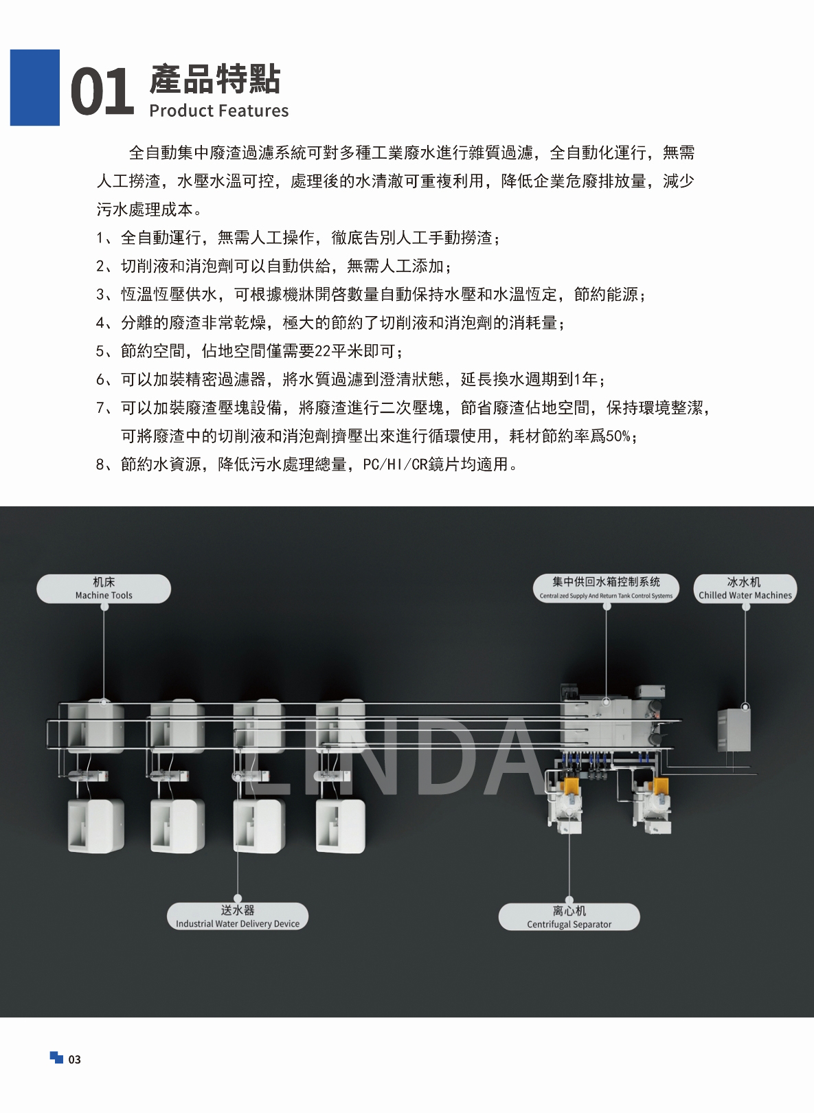 全自動集中廢渣過濾系統可對多種工業廢水進行雜質過濾,全自動化運行,無需人工撈渣,水壓水溫可控,處理後的水清澈可重複利用,降低企業危廢排放量,減少污水處理成本。