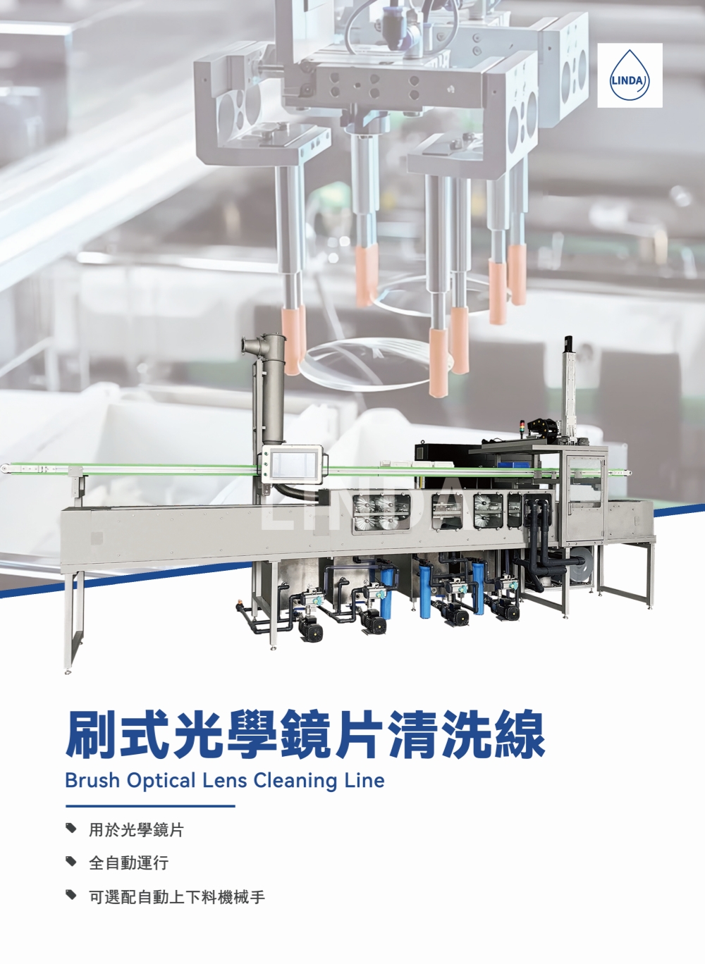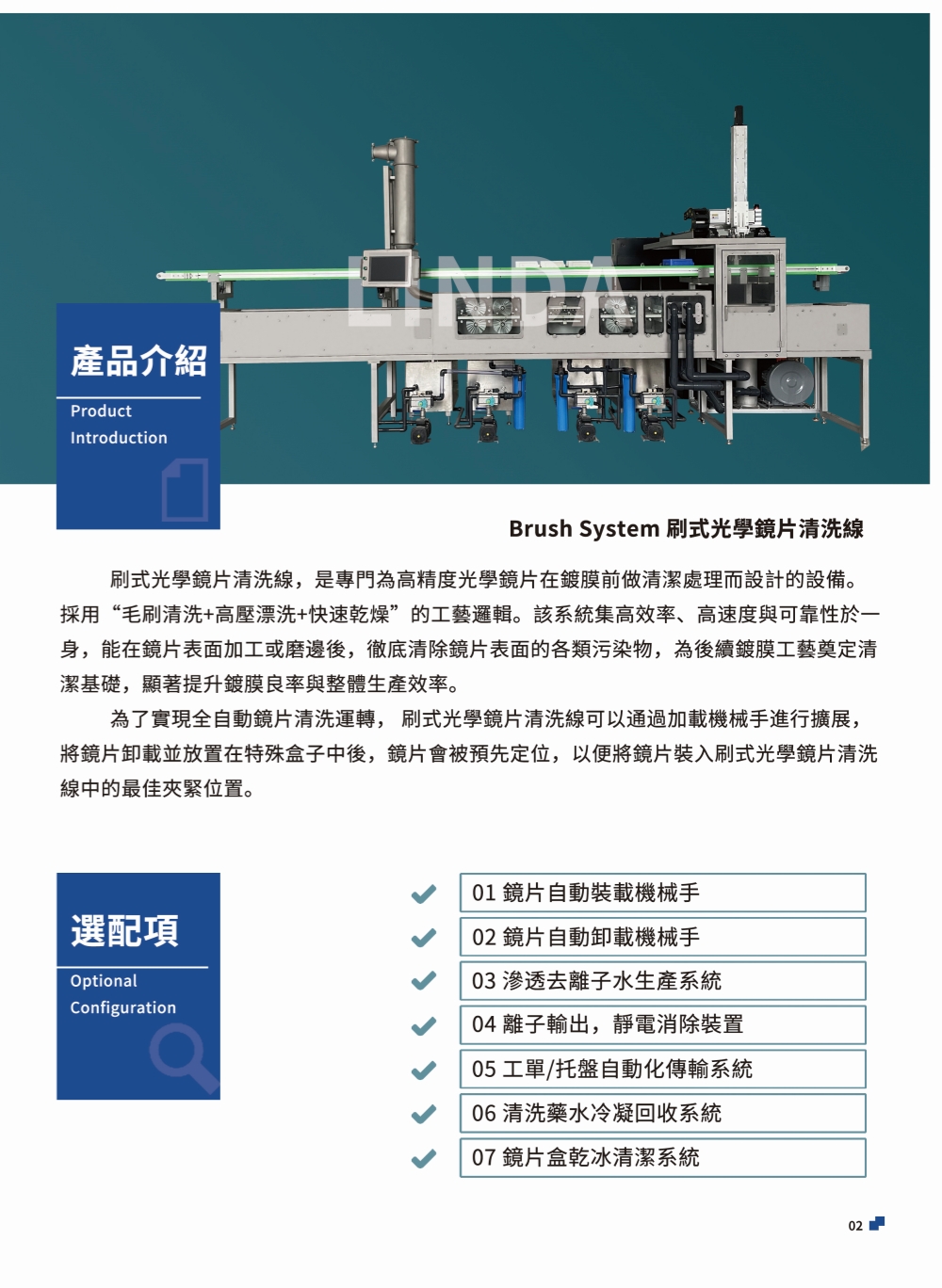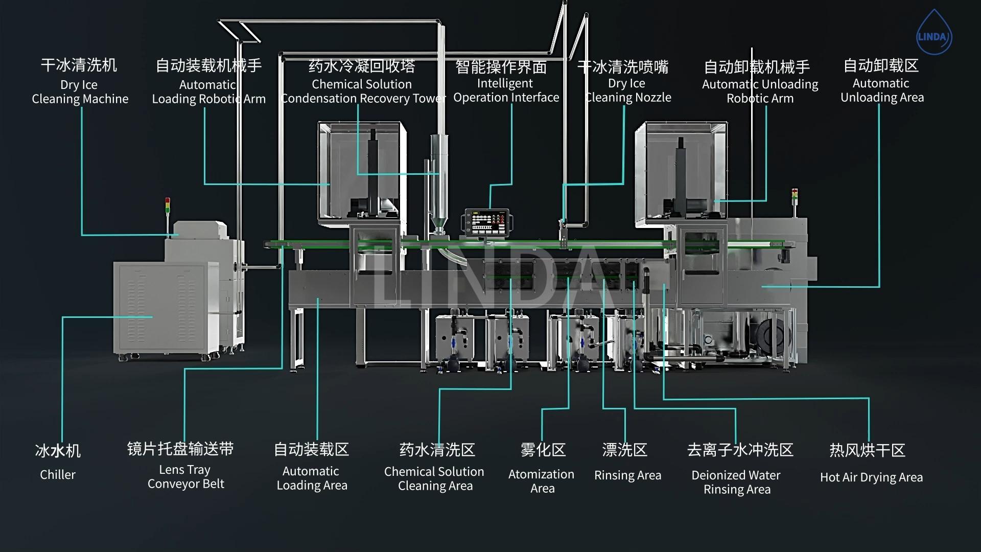 該設備是一個全自動化刷式光學鏡片清洗系統,具備強大且高效的串聯式系統,可以清除化學品殘留、指紋等污染物,為後續塗層工藝準備好各種不同型號的鏡片。