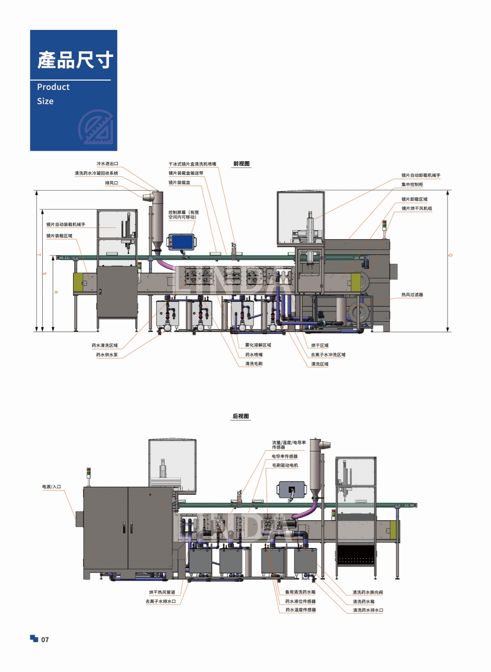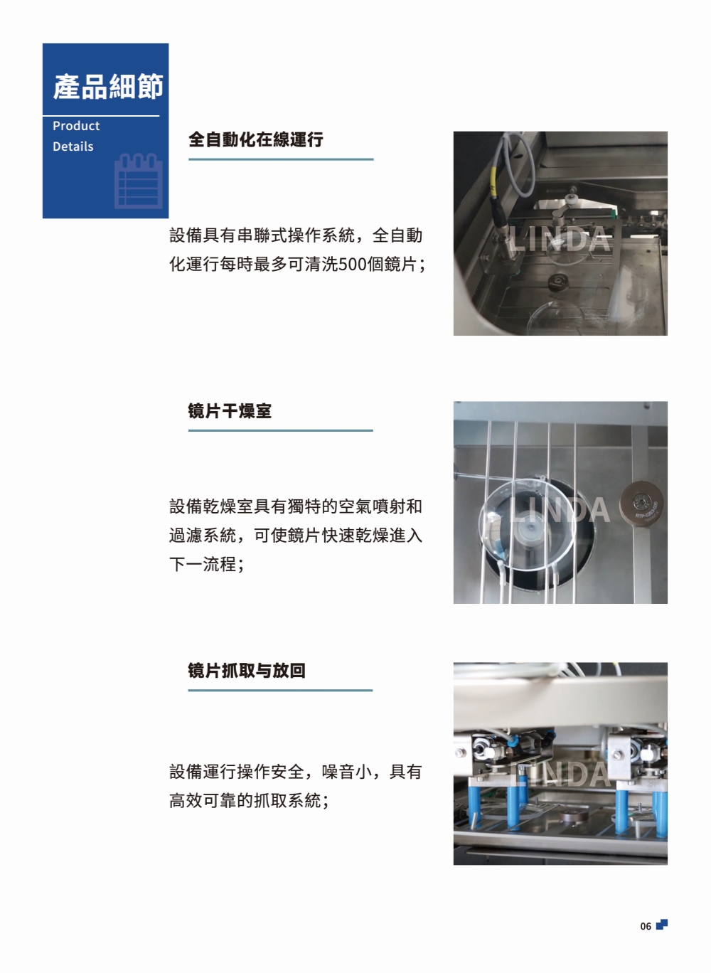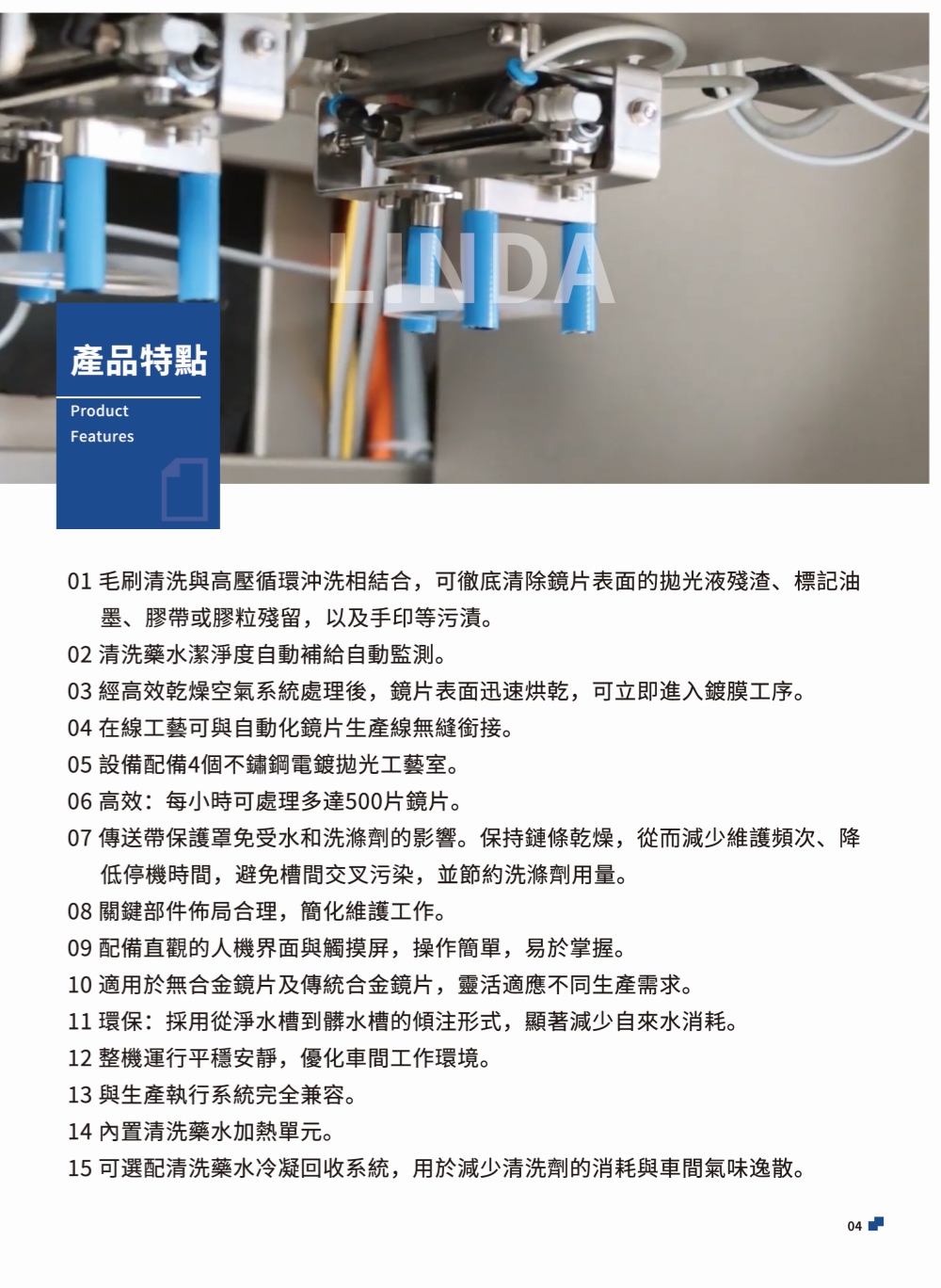 該設備是一個全自動化刷式光學鏡片清洗系統,具備強大且高效的串聯式系統,可以清除化學品殘留、指紋等污染物,為後續塗層工藝準備好各種不同型號的鏡片。